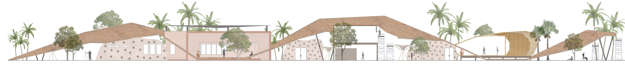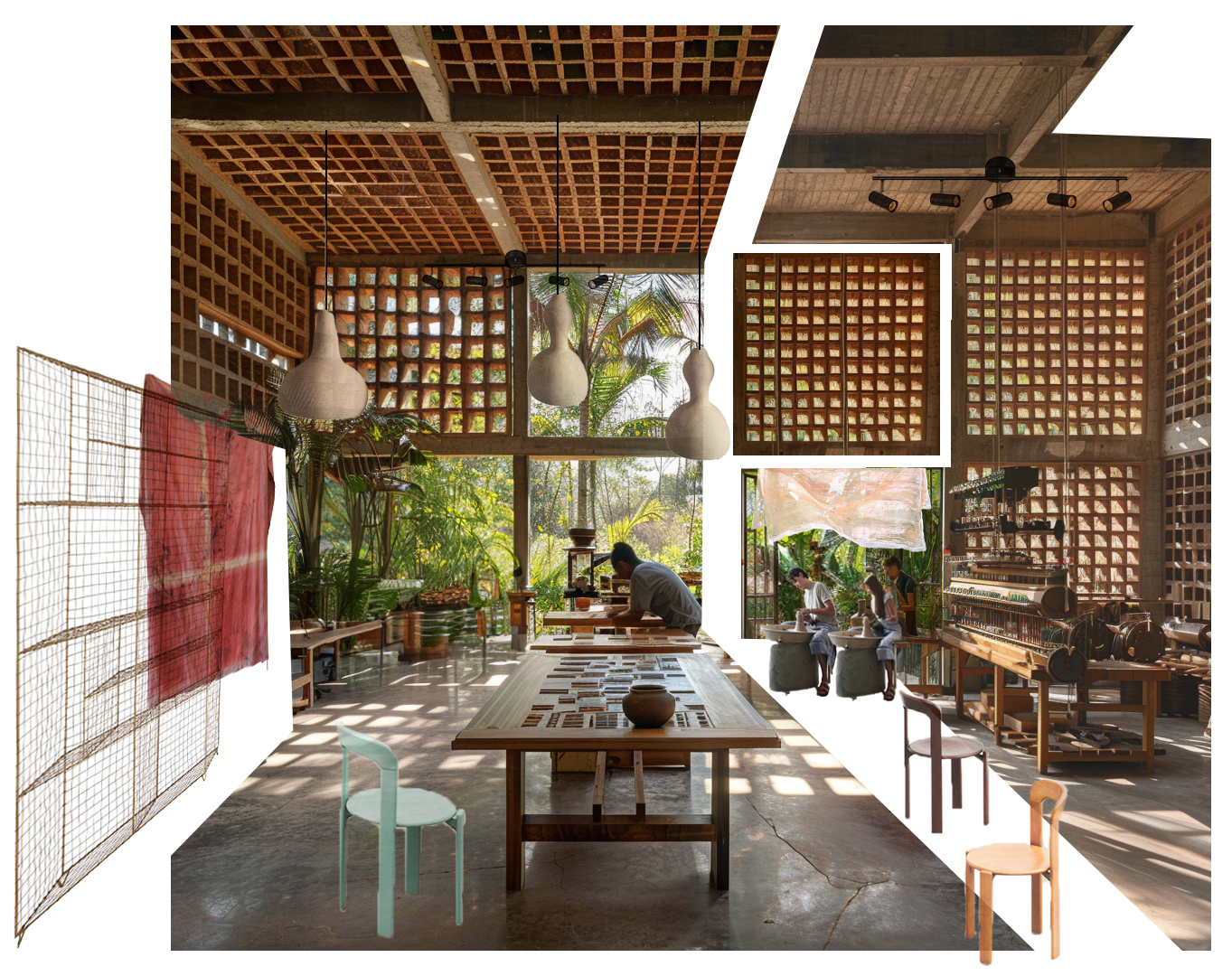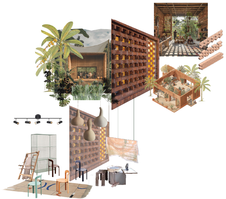 Houses ceramic and textile workshops where perforated brick walls provide ventilation and shade while creating defined learning spaces.