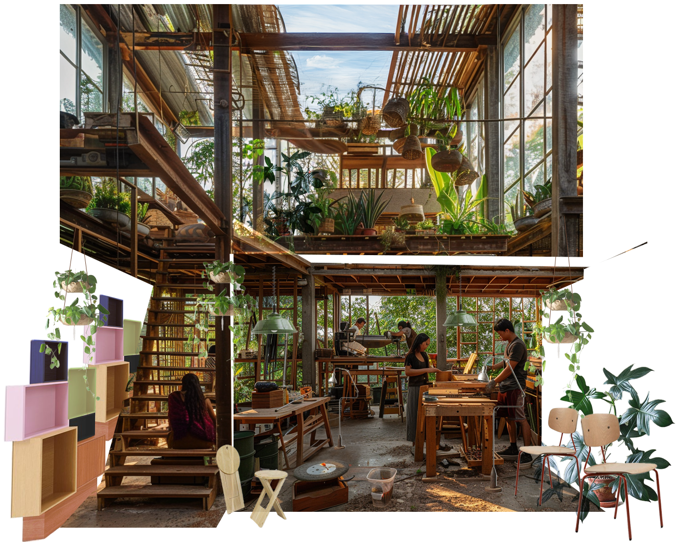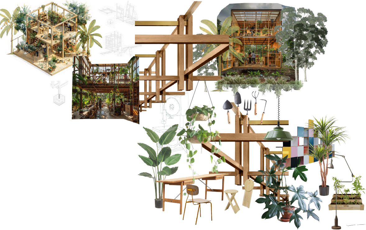 A narrow two-story rectangular space where carpentry and gardening classes are taught, using the structure’s openings to provide natural light for plants.