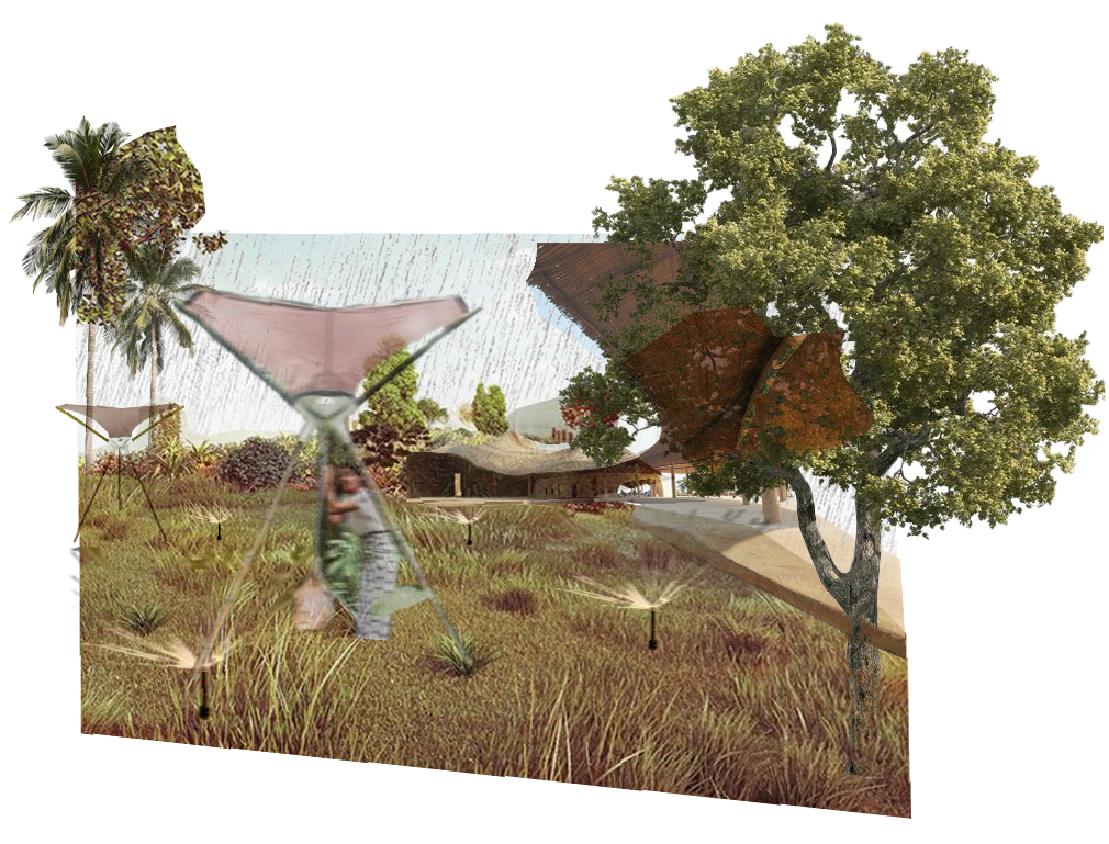 Bamboo and tensioned fabric structures that, when positioned as funnels, capture rainwater through gravitational flow, providing an accessible solution to harvest precipitation for the project’s irrigation and consumption needs after filtration.
