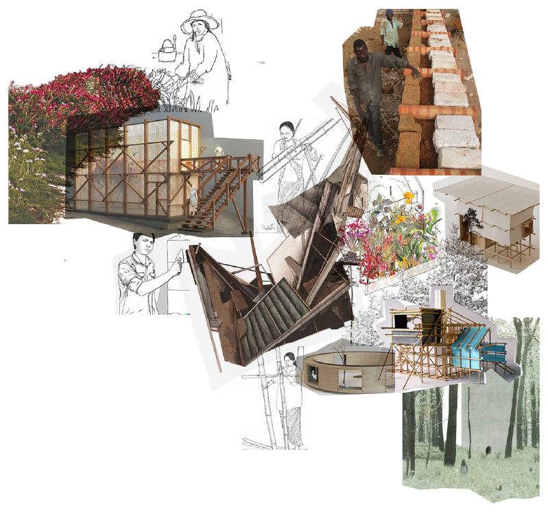 Self-built structures using simple techniques that can be taught through community workshops, emphasizing knowledge transfer between generations.