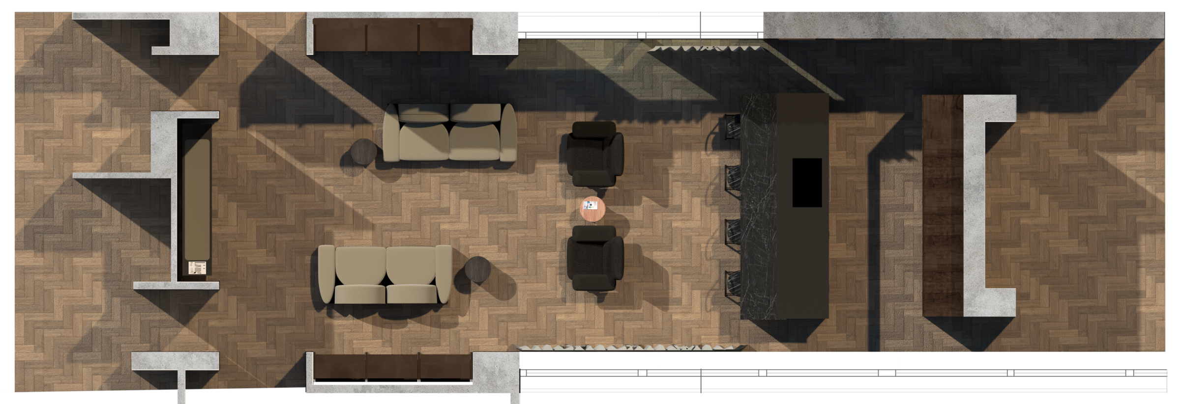 A floor plan that reveals not only the spatial layout, but also visualizes the various lighting accents throughout the open-plan area and how these complement the selected materials.